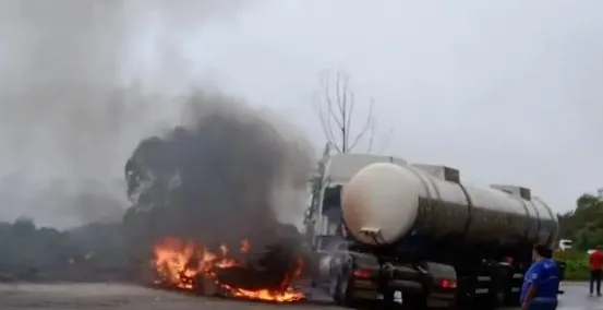 Com o impacto, um dos veículos pegou fogo e os dois ocupantes morreram no local
