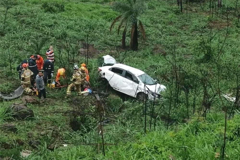 Carro com quatro pessoas sai da pista e cai em ribanceira de 30 metros na BR-381, em Caeté