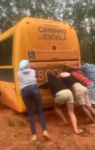 Estudantes empurram ônibus atolado para conseguir chegar a local de prova do Enem 2024