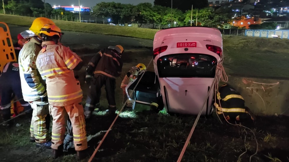 Carro capota, fica pendurado e quase cai da pista da Via Expressa em Contagem (MG)