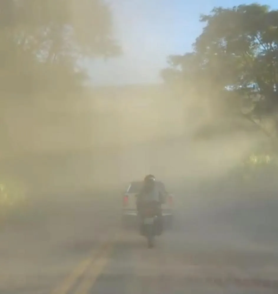 Serviços de roçada e limpeza realizados pelo DER-MG levantam nuvens de poeira, reduzindo a visibilidade e aumentando o perigo na estrada.