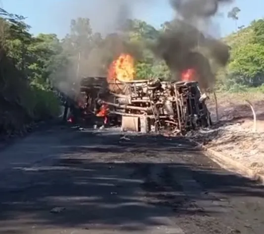 Acidente com caminhão-tanque provoca incêndio e interdita LMG-744 em Virgolândia