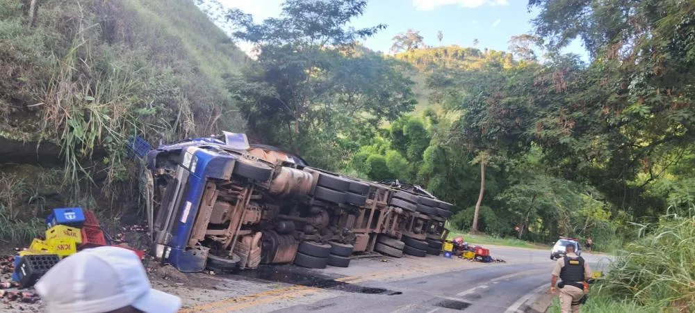 Carreta com engradados de cerveja tomba na MGC-120 em Ferros