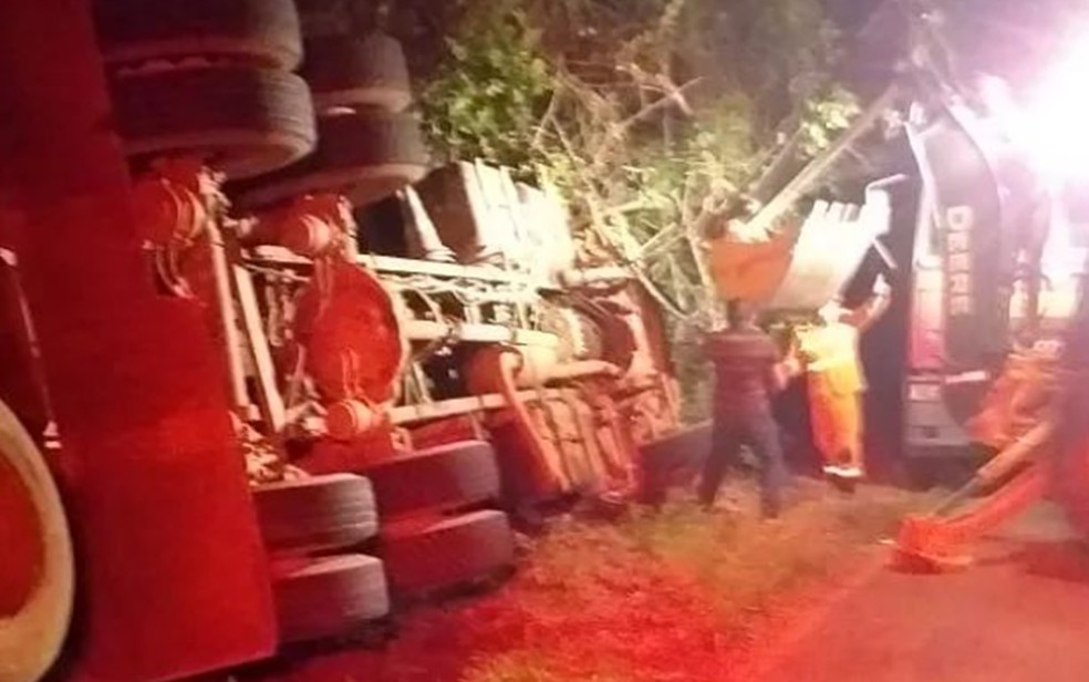 Homens ficam feridos após caminhão carregado com carvão tombar na AMG-1665, em Ingaí, MG