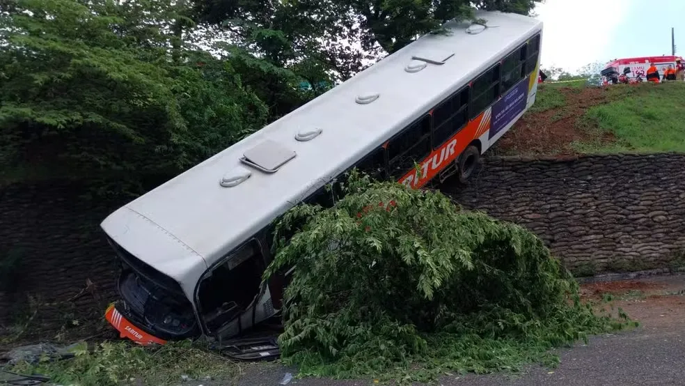 Ônibus da empresa Saritur caiu em uma ribanceira na avenida Usiminas, na altura do bairro Bela Vista.