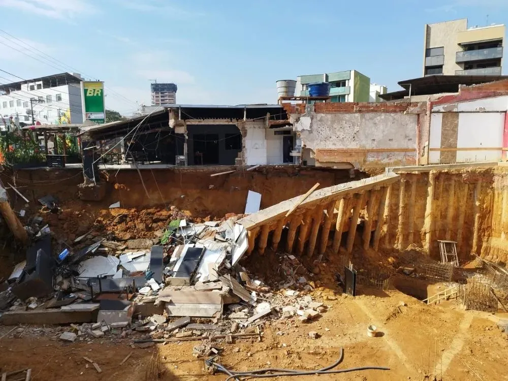 Durante escavação de subsolo para construção de prédio, parte da estrutura cedeu e atingiu restaurante ao lado; ninguém ficou ferido