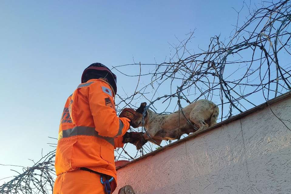 Cachorro fica preso em concertina e é resgatado pelos bombeiros em Lagoa Santa