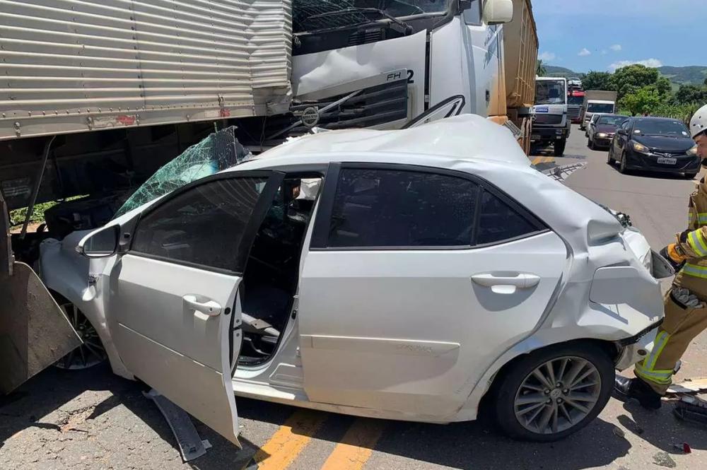 Carro é prensado em engavetamento de caminhões que só registrou feridos leves