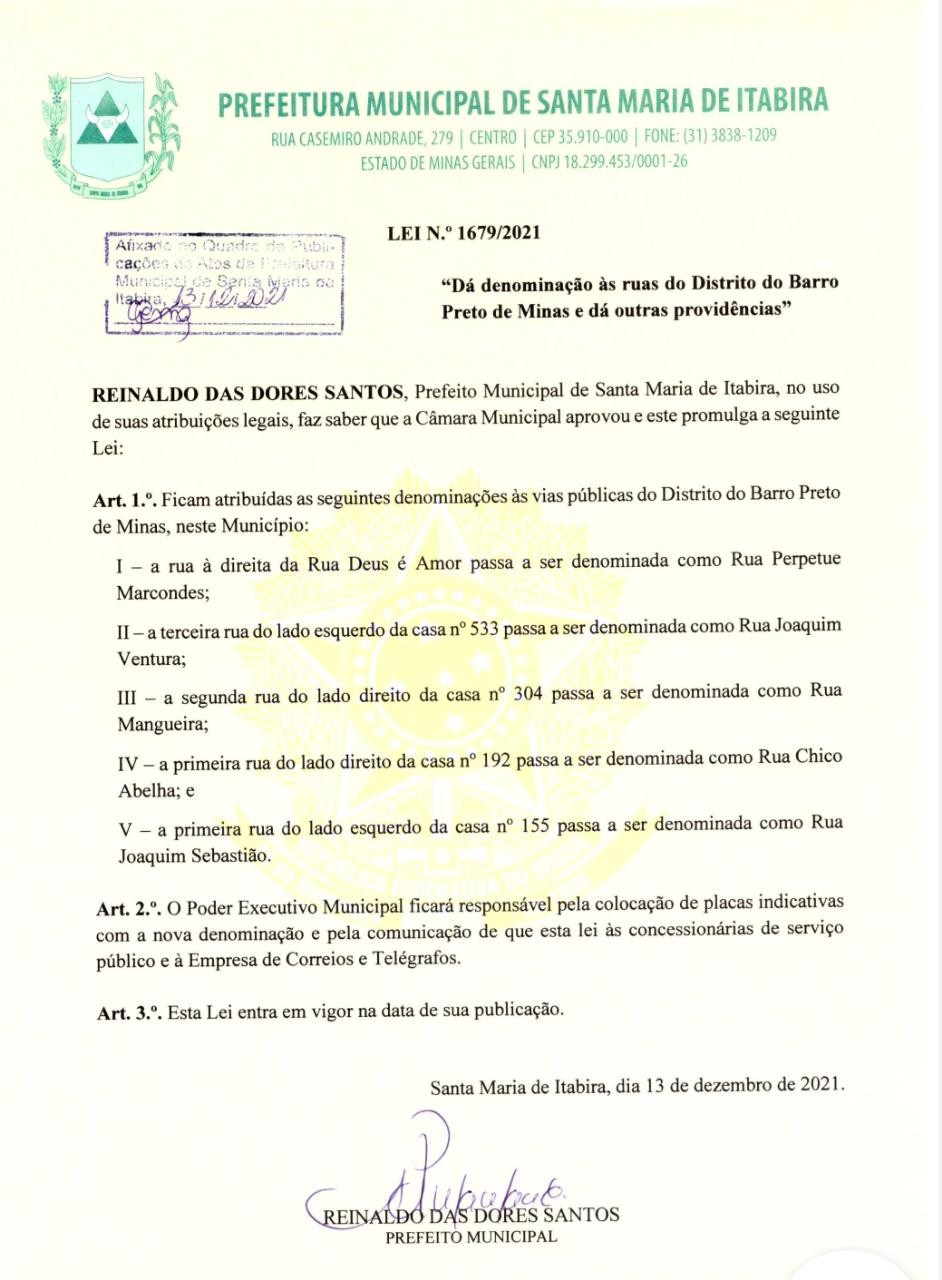 As Ruas da Comunidade Quilombola Barro Preto, no município de Santa Maria de Itabira (MG), ganharam nome(s) neste mês de Dezembro de 2021. A Lei Municipal que oficializa os nomes das vias do Barro Preto, entrou em vigor no dia 13/12/2021 aprovada pelo Prefeito Reinaldo das Dores Santos. Com isso, a Prefeitura fica também responsável por colocar placas indicativas com o nome da(s) rua(s) e ainda comunicar às concessionárias de serviço público e à Empresa de Correios e Telégrafos sobre as novas denominações.