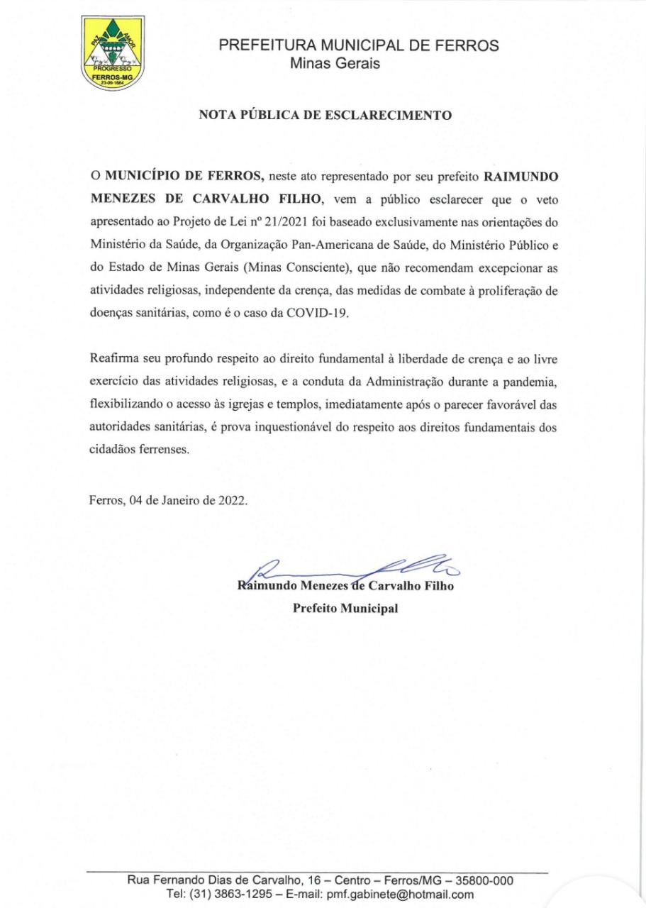 Raimundo Menezes de Carvalho Filho, conhecido como Diquinho, Prefeito do município de Ferros (MG), emitiu nesta terça-feira (04/01/2022) uma Nota de Esclarecimento, sobre veto apresentado ao Projeto de Lei N°21/2021. O Prefeito também reafirmou o seu profundo respeito ao direito fundamental à liberdade de crença e ao livre exercício das atividades religiosas, e a conduta da administração durante a pandemia, flexibilizando o acesso às Igrejas e Templos, imediatamente após o parecer favorável das autoridades sanitárias, é prova inquestionável do respeito aos direitos fundamentais dos cidadãos ferrenses.