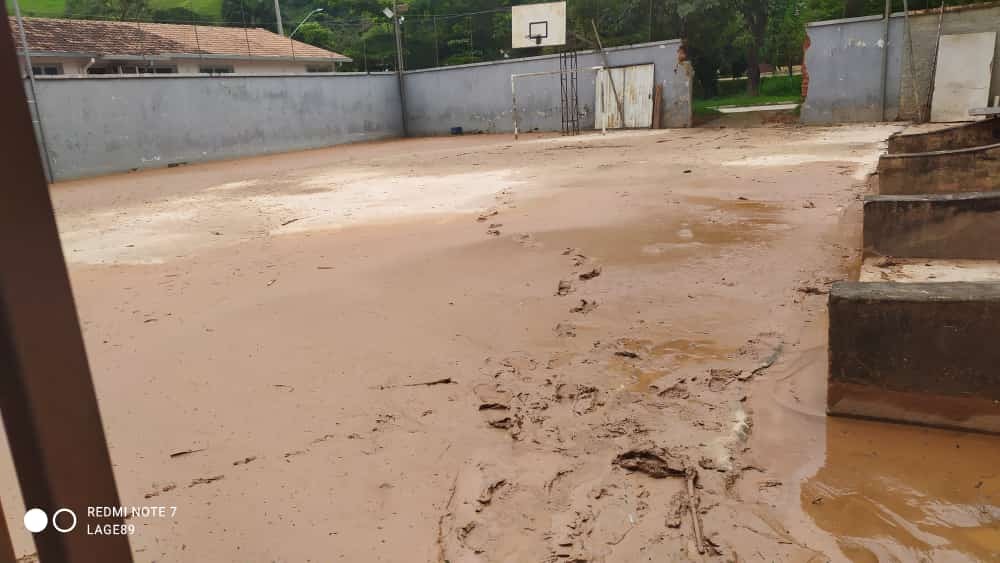 A enxurrada invadiu a Biblioteca, Quadra, Secretaria, Pátio e até a Cozinha da Escola.