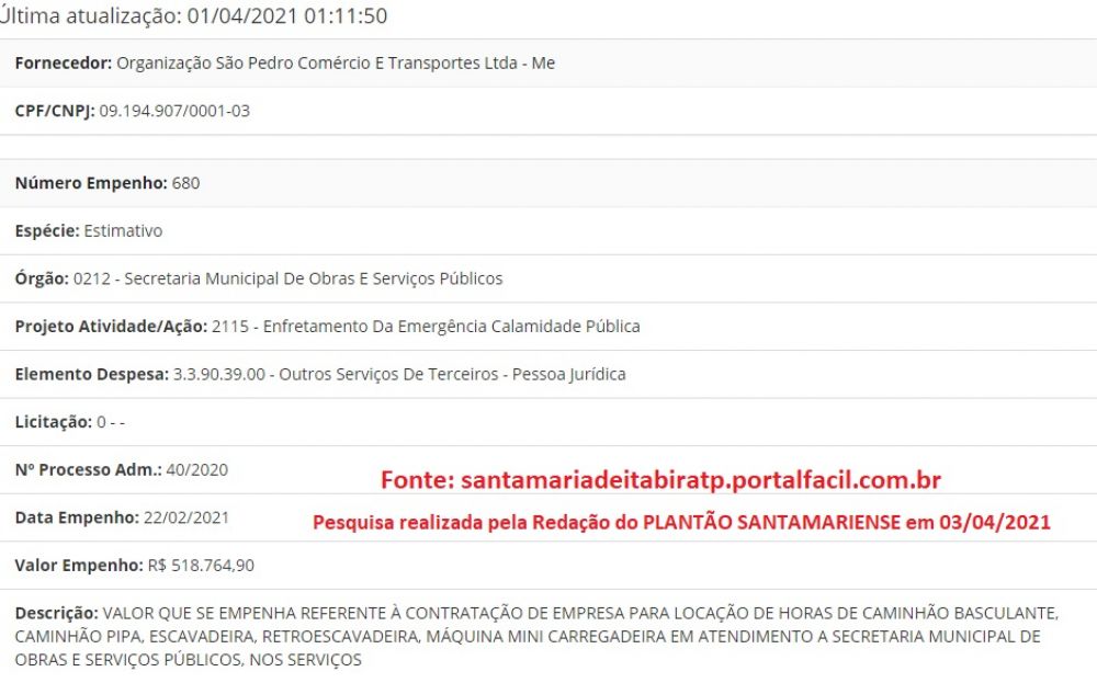 A Prefeitura de Santa Maria de Itabira empenhou mais de R$ 3,1 Milhões em razão da tragédia que ocorreu no município, no dia 21 de fevereiro de 2021, conforme informações coletadas nesta segunda-feira (05/04), às 06h01, no Portal da Transparência. Empenhos para Locação de Máquinas e Caminhões, e fornecimento de Café da Manhã e Lanches e Marmitex, representam a maior parte de valores empenhados até o momento, e já somam R$ 2.153.414,90 (Dois Milhões, Cento e Cinquenta e Três Mil, Quatrocentos e Quatorze Reais e Noventa Centavos.