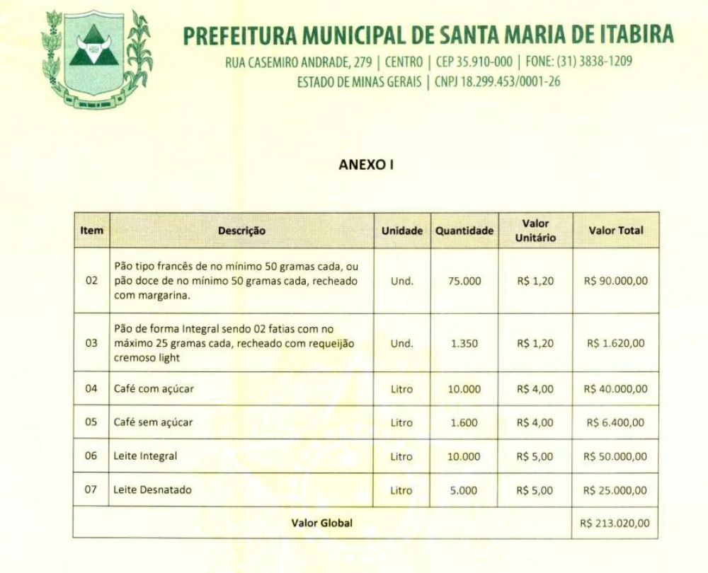 Na 5ª cláusula do contrato, 5.1 detalha que os produtos contratados foram; Café da manhã e lanche da tarde, servidos em materiais descartáveis, contendo; Pão tipo francês de no mínimo 50 gramas cada, ou Pão doce no mínimo 50 gramas cada, recheado com margarina; Pão de forma; Integral sendo 2 fatias com no máximo 25 gramas cada, recheado com requeijão cremoso light, Café preto com açúcar, Café preto sem açúcar, leite desnatado ou leite integral, disponibilização de adoçante.
