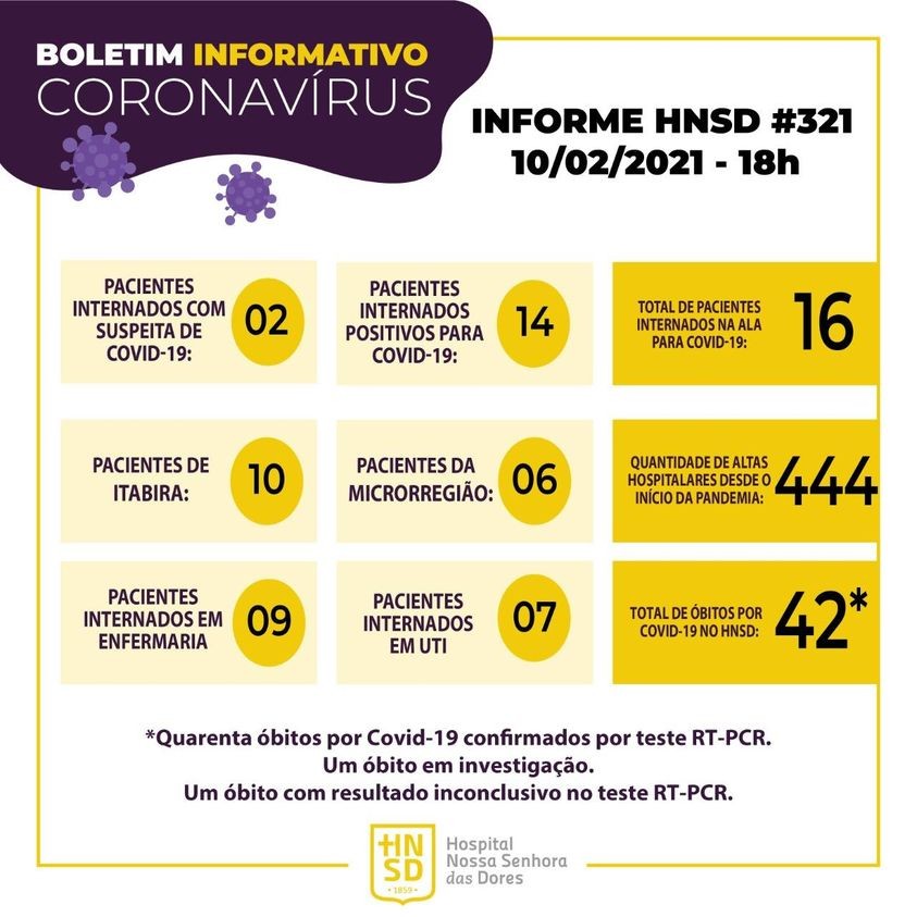 O Hospital Nossa Senhora das Dores (HNSD) informou nesta quarta-feira dia 10 de fevereiro de 2021, a morte de uma moradora de Itabira com coronavírus, que estava internada naquela unidade hospitalar. Desde o início da pandemia, o HNSD já registrou 42 mortes pela doença.