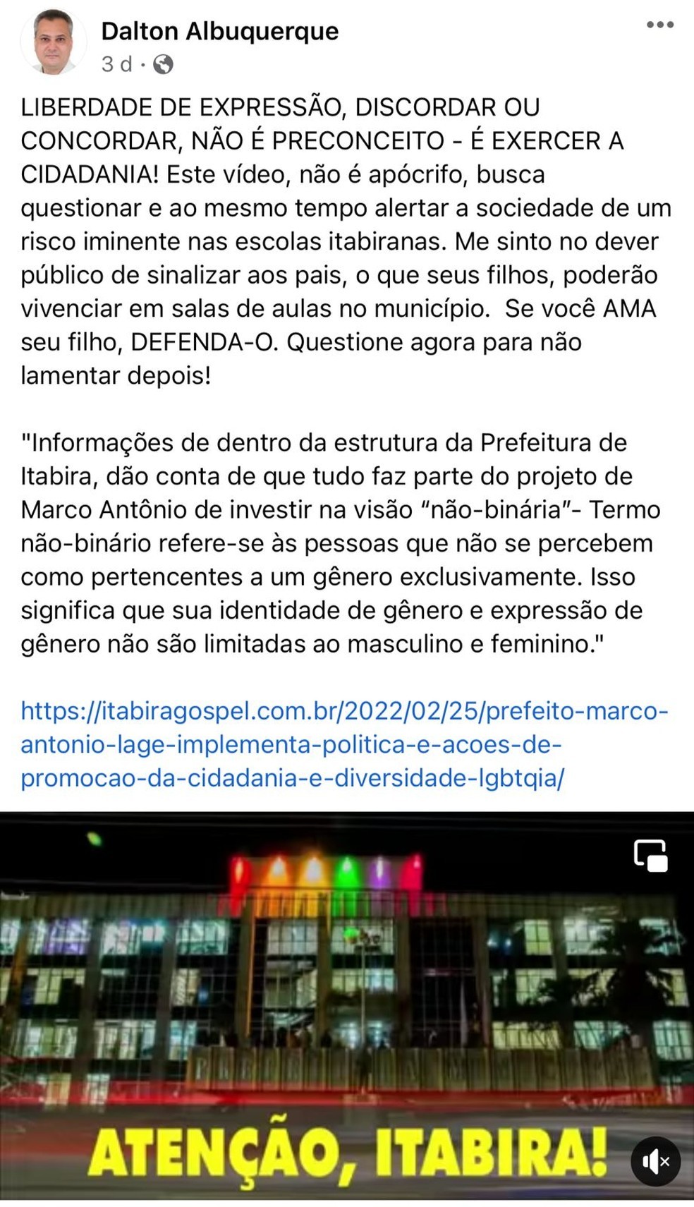 As imagens terminavam com a frase: "O senhor prefeito tem que zelar pela integridade da família itabirana".