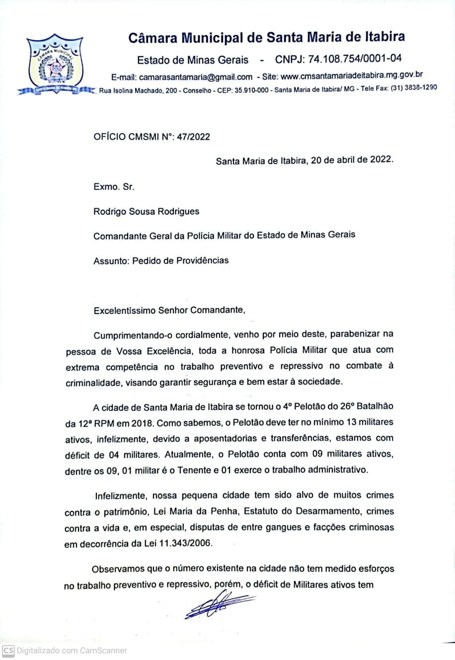 Buscando diálogo com o comando da corporação policial, o vereador Jair Lino de Carvalho Lage (CIDADANIA) encaminhou um ofício ao comandante geral da Polícia Militar de Minas Gerais Rodrigo Sousa Rodrigues, solicitando o preenchimento das vagas no Pelotão de Santa Maria de Itabira, visando preservar a ordem pública, os direitos e garantias constitucionais, a integridade física e patrimonial dos cidadãos.