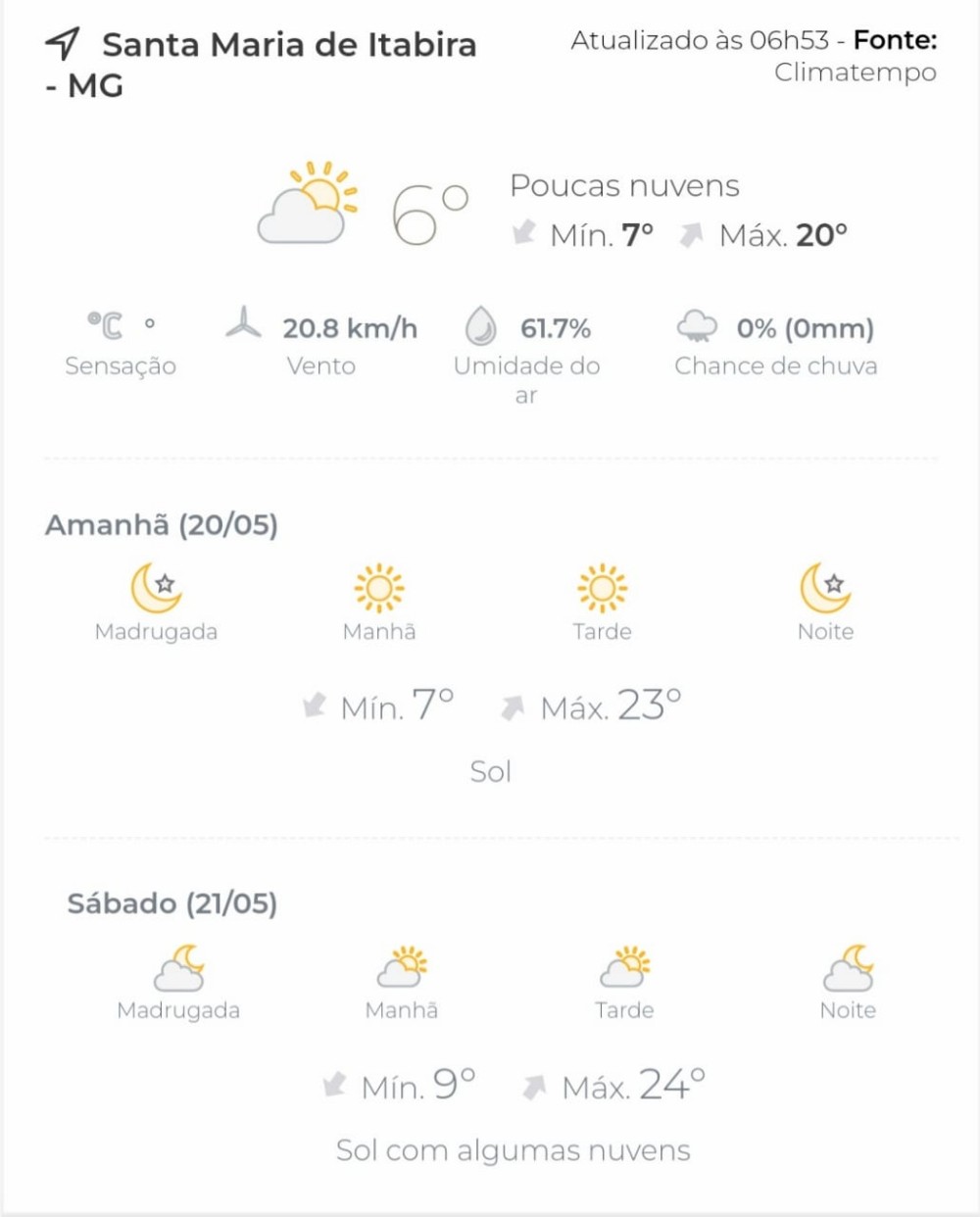 Comunicado divulgado pela Defesa Civil de Santa Maria de Itabira na manhã dessa quarta-feira (18) já alertava para a baixa temperatura nesta semana devido a atuação da massa de ar polar. Os termômetros devem ficar abaixo de 10 °C pelo menos até sábado (21).