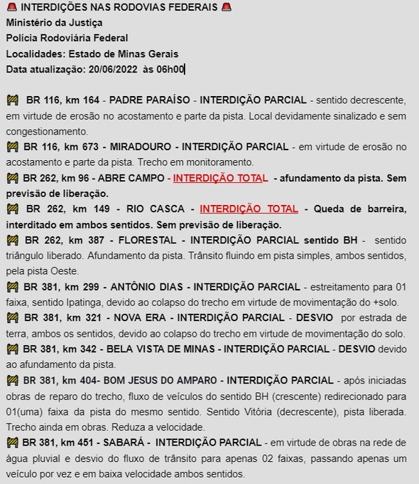Para facilitar o tráfego, um mapa interativo é atualizado diariamente com os principais pontos de interdição. Clique aqui e confira todos os trechos com interdição total ou parcial nas estradas que cortam Minas Gerais e saiba o que fazer para evitá-los.