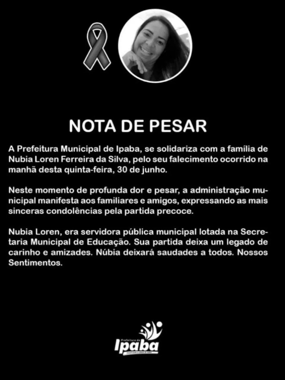 Nubia era funcionária de uma escola municipal da cidade. A Prefeitura de Ipaba divulgou uma nota de pesar.