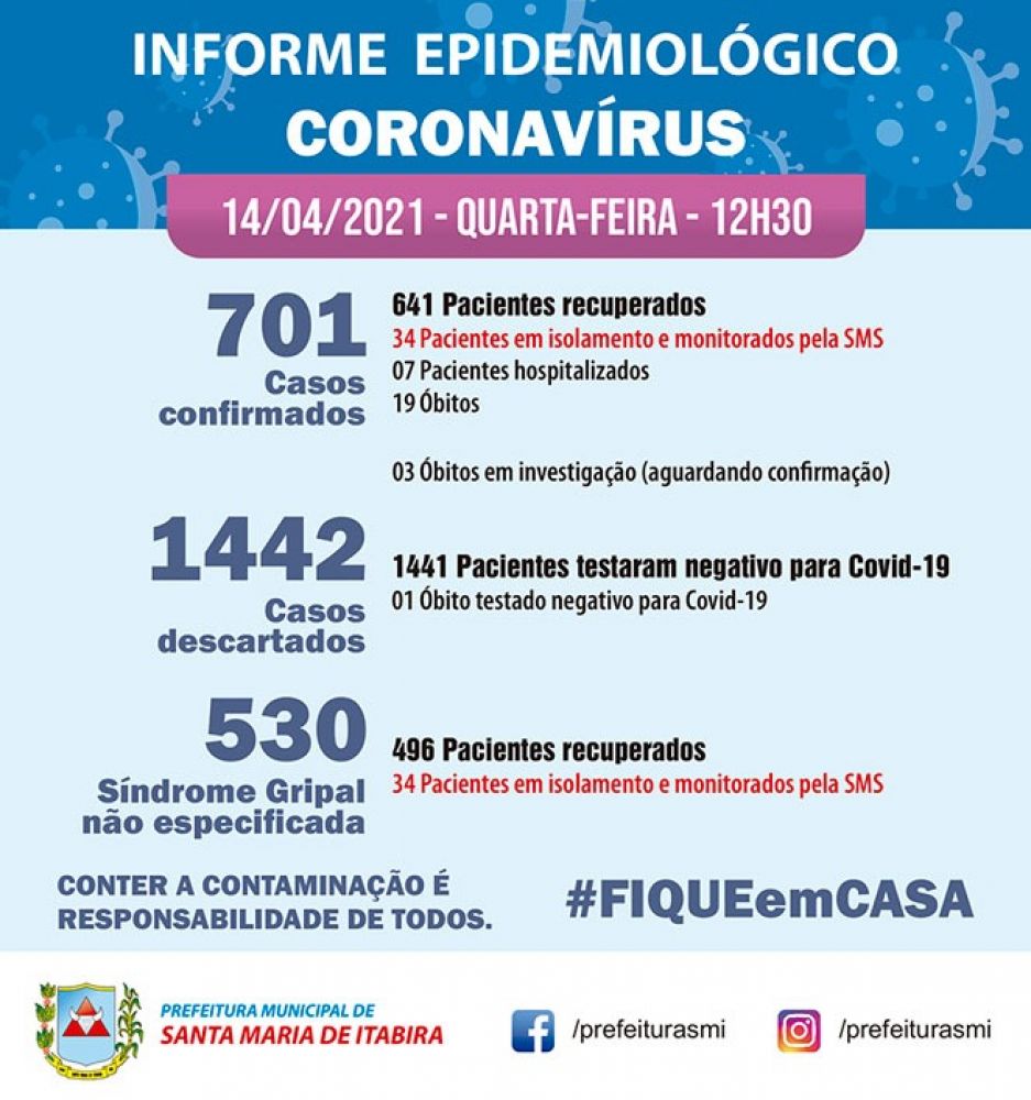 Segundo o Boletim Epidemiológico Coronavírus, divulgado pela Prefeitura nesta quarta-feira (14/04), o município registrou desde o inicio da pandemia 701 Casos Confirmados, dentre eles são; 19 óbitos confirmados, 07 pacientes hospitalizados, 34 pacientes em isolamento e monitorados pela SMS, e 641 pacientes recuperados.
