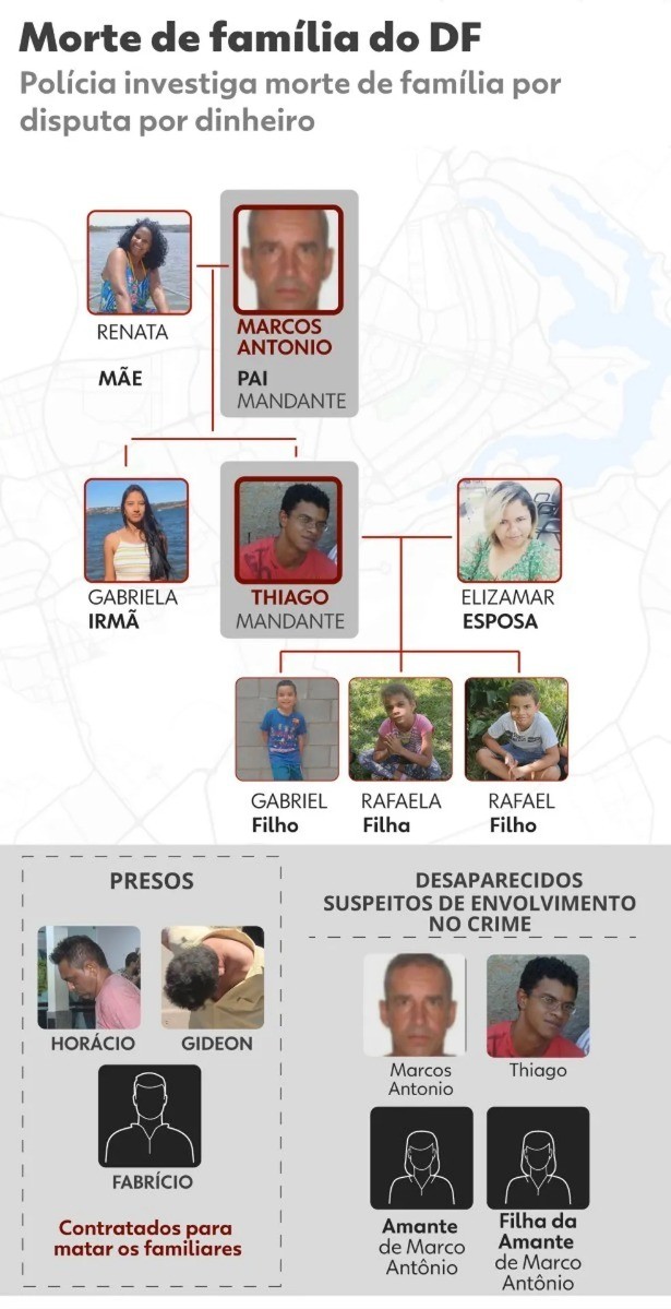 Segundo o delegado Ricardo Viana, da 6ª Delegacia de Polícia do Paranoá, um dos homens presos por envolvimento no crime, Horácio Carlos Ferreira Barbosa, de 49 anos, contou que ele e Gideon Batista de Menezes, de 55 anos, receberam R$ 100 mil para matar a cabeleireira, os três filhos — Gabriel, de 7 anos, e os gêmeos Rafael e Rafaela, de 6 anos —, a sogra e a cunhada da mulher.