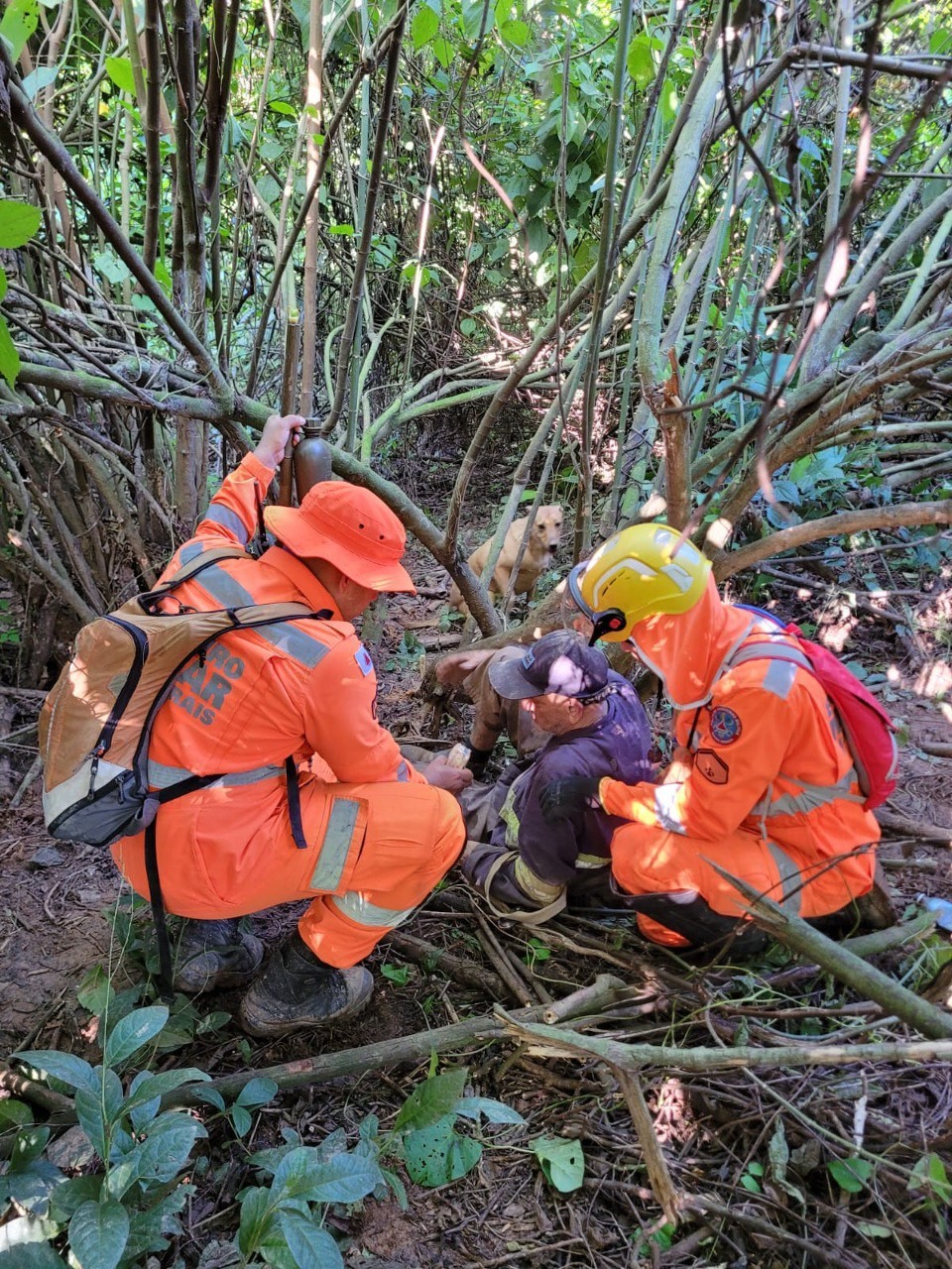 A partir das informações, os bombeiros se dividiram em dois grupos para procurar o idoso. Eles foram para uma região de mata e seguiram por trilhas distintas durante as buscas. O cachorro então latiu, chamando a atenção dos militares. O animal estava ao lado do tutor, que se encontrava deitado no chão em meio à mata fechada.