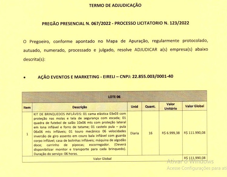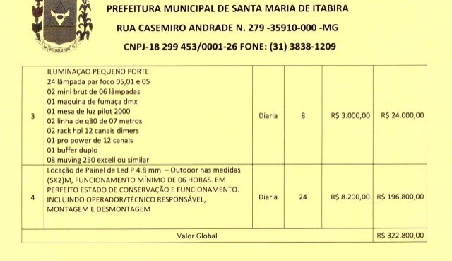 A Prefeitura de Santa Maria de Itabira realizou em (29/12/2022) a abertura de processo licitatório para futura e eventual contratação de empresa especializada em locação de estrutura, tais como palco, som, iluminação, tendas, barracas, telões, placas de fechamento, grades de contenção, gerador e outros para realização de possíveis eventos, em atendimento a todas as Secretarias do Município de Santa Maria de Itabira. O valor total das futuras e eventuais contratações podem chegar a R$ 1.006,919,98 (UM MILHÃO E SEIS MIL E NOVECENTOS E DEZENOVE REAIS E NOVENTA E OITO CENTAVOS) conforme consta no termo de adjudicação do pregão presencial N 67/2022 - Processo Licitatório 123/2022 assinado em 24/01/2023. O Documento está no portal de transparência da Prefeitura e pode ser acessado ao final desta matéria e/ou também pelo link: CLIQUE AQUI.