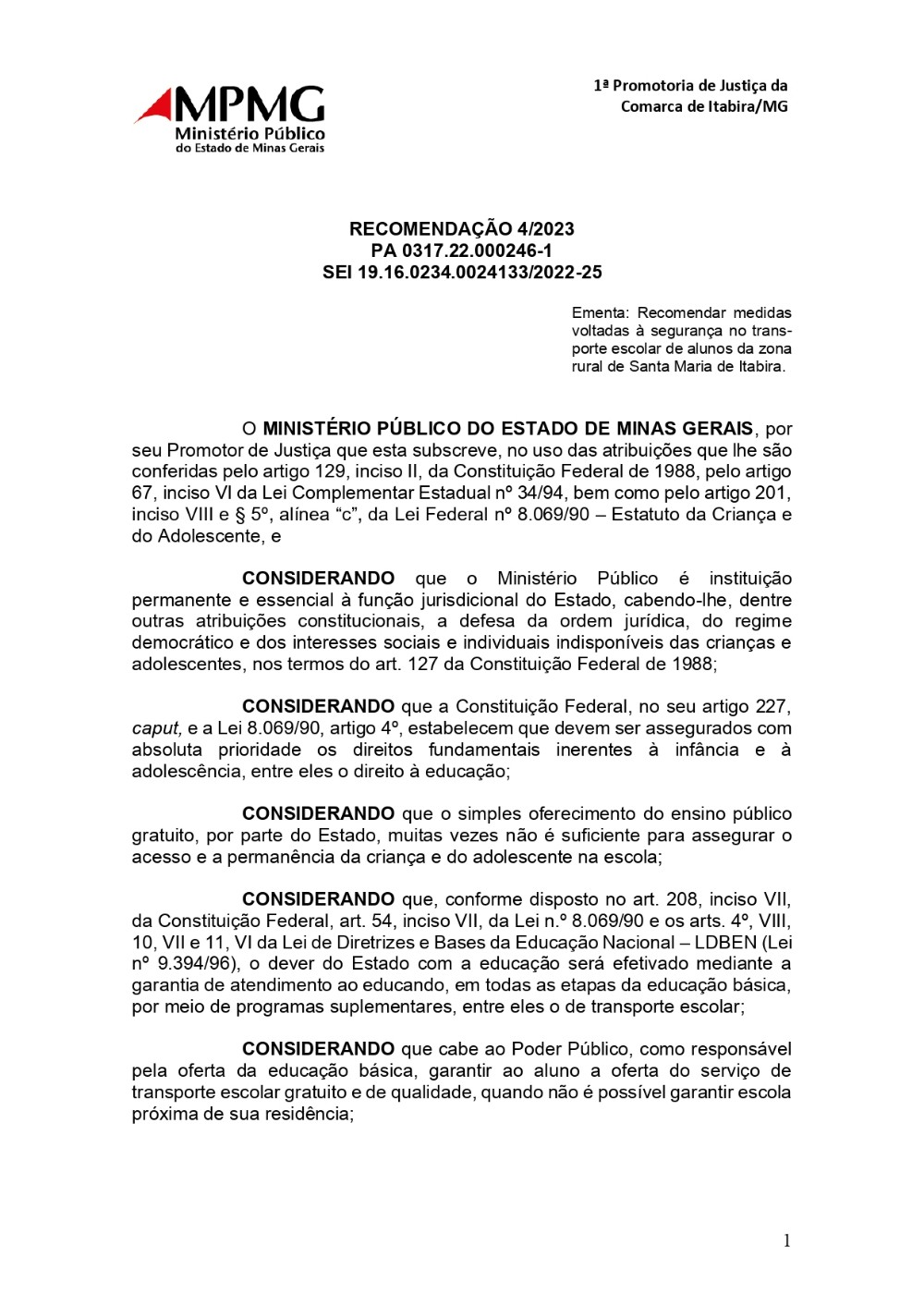 A Recomendação foi expedida pela 1ª Promotoria de Justiça da Comarca de Itabira/MG. (veja abaixo algumas considerações do MPMG)