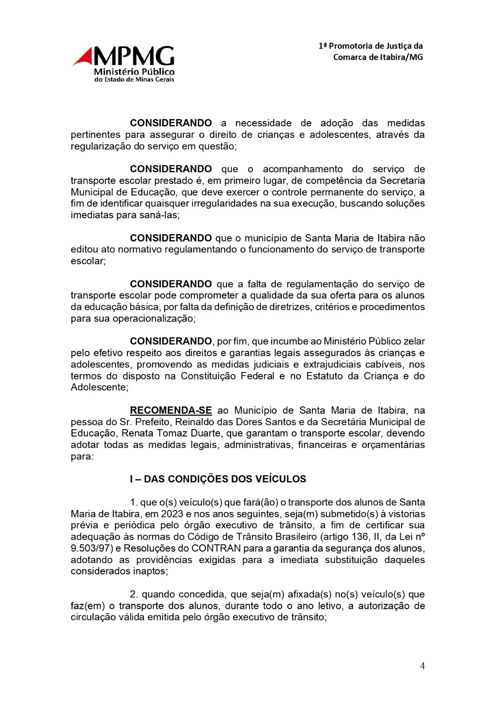 Pais de Alunos de Santa Maria de Itabira (MG), que utilizam o transporte escolar público do município, devem ficar atentos as irregularidades e denunciar qualquer situação que possa colocar a vida dos alunos em risco. No dia (19/04/2023) o Ministério Público de Minas Gerais notificou o Prefeito Reinaldo das Dores Santos e a Secretaria Municipal de Educação após diversas irregularidades encontradas no transporte escolar do município. Dentre as considerações do Ministério Público contidas na recomendação,o órgão afirma que em Santa Maria de Itabira, foram noticiadas irregularidades como; "Transporte Escolar de crianças na carroceria de caminhonetes" e ainda que "há motoristas do transporte escolar conduzindo alunos sem habilitação e/ou sem comprovação de terem sido aprovados no curso de capacitação para o transporte de escolares" além de outras irregularidades no transporte.
