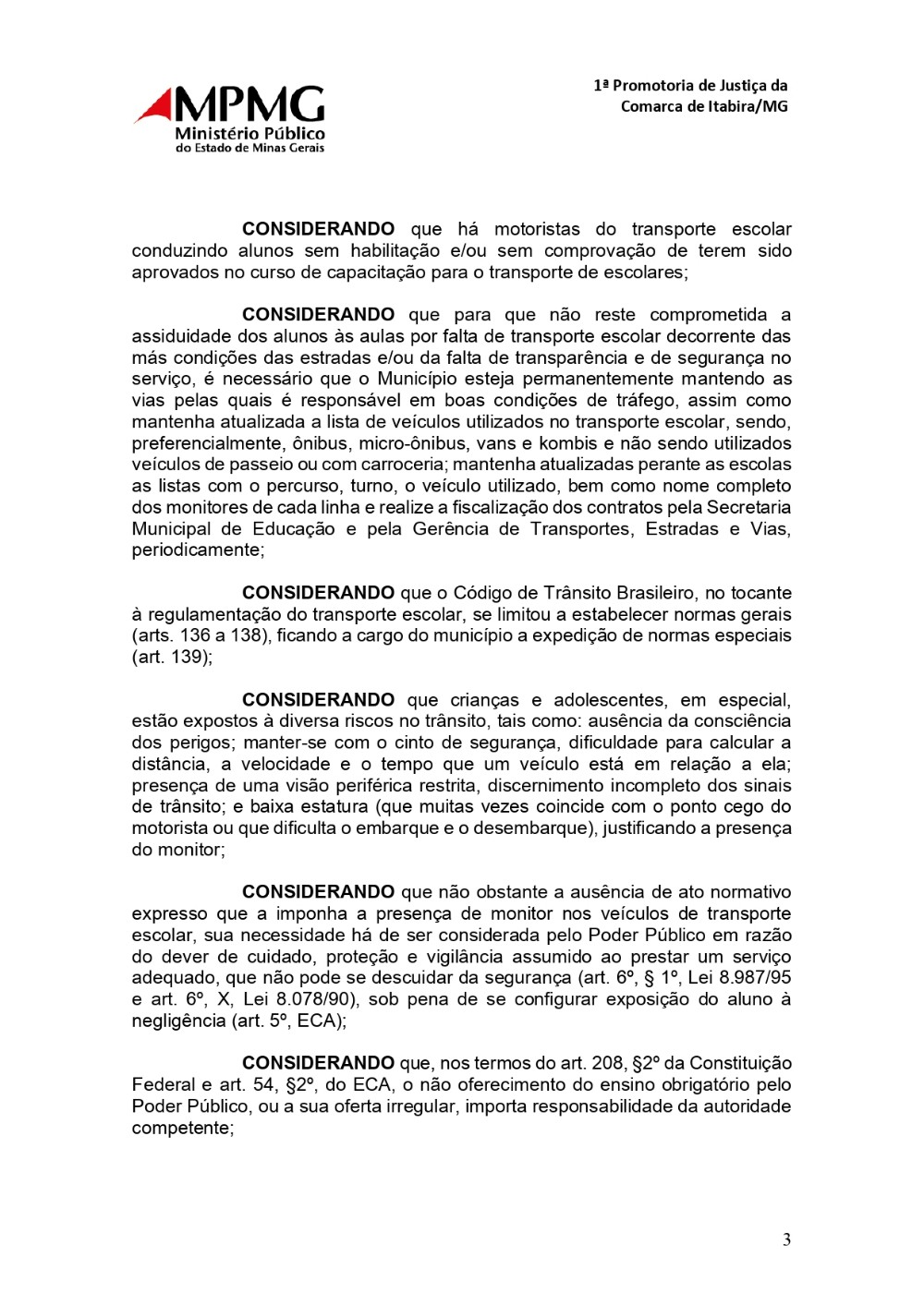 2. quando concedida, que seja(m) afixada(s) no(s) veículo(s) que faz(em) o transporte dos alunos, durante todo o ano letivo, a autorização de circulação válida emitida pelo órgão executivo de trânsito; 1ª Promotoria de Justiça da Comarca de Itabira/MG 5