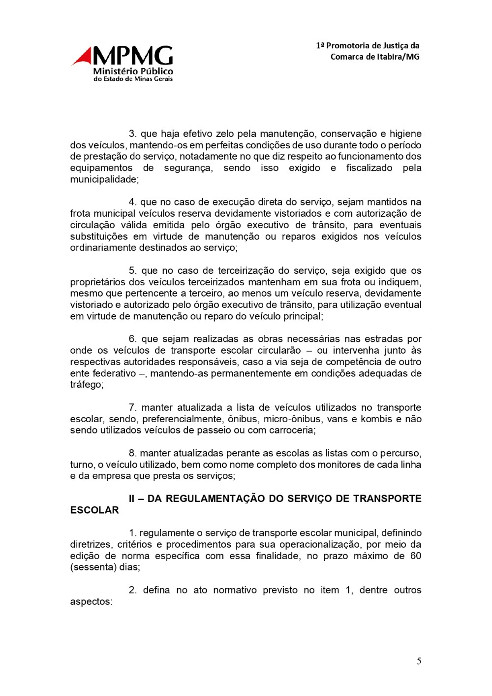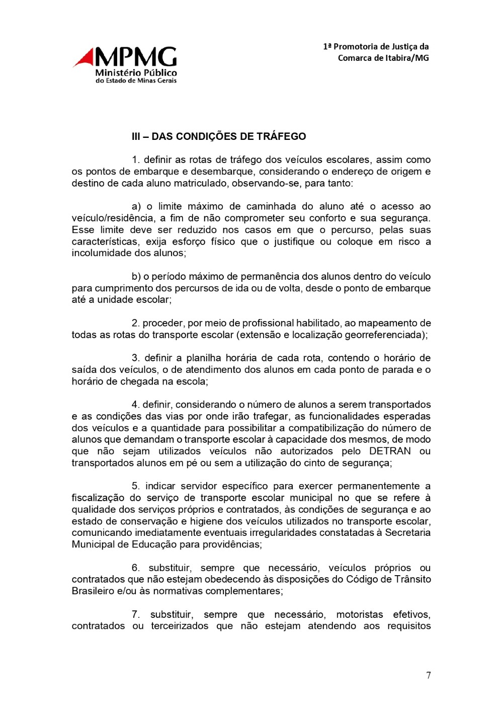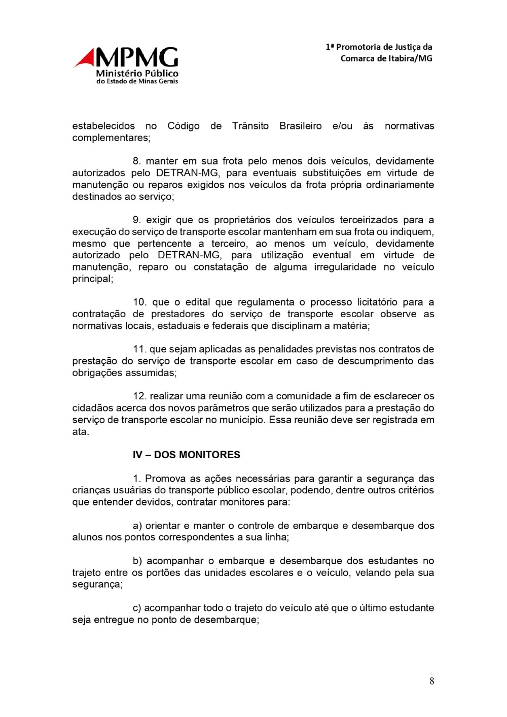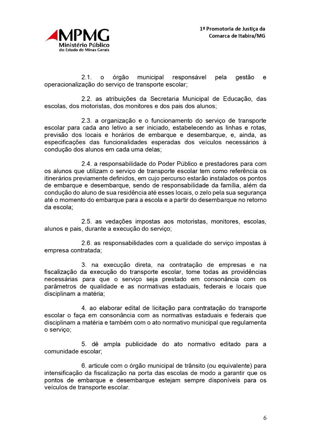 6. articule com o órgão municipal de trânsito (ou equivalente) para intensificação da fiscalização na porta das escolas de modo a garantir que os pontos de embarque e desembarque estejam sempre disponíveis para os veículos de transporte escolar. 1ª Promotoria de Justiça da Comarca de Itabira/MG