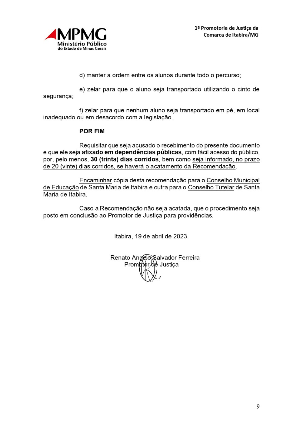 c) acompanhar todo o trajeto do veículo até que o último estudante seja entregue no ponto de desembarque; 1ª Promotoria de Justiça da Comarca de Itabira/MG 9