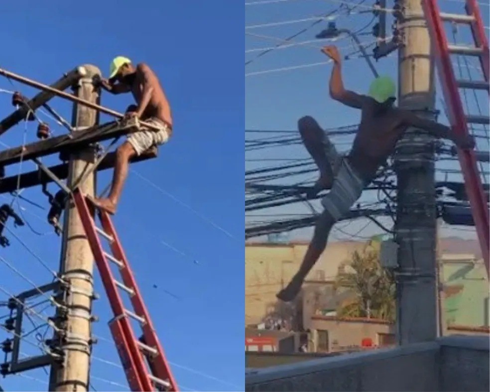 Fábio Martins subiu no poste por volta das 16h30 de sexta-feira (4), com um pedaço de ripa retirado do telhado de casa, para tentar escapar de um mandado de prisão.