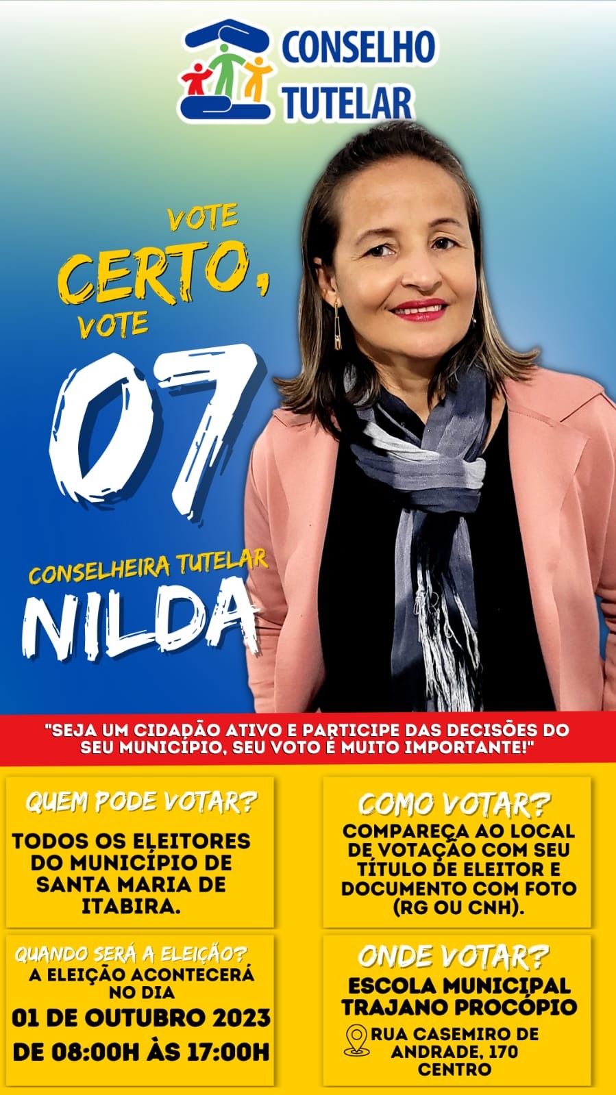Santa Maria de Itabira se prepara para a eleição do Conselho Tutelar. A eleição, que ocorrerá no dia 1° de outubro, é organizada pelo Conselho Municipal da Criança e Adolescente (CMDCA) e conta com apoio da Prefeitura Municipal, por meio da Secretaria de Assistência Social.