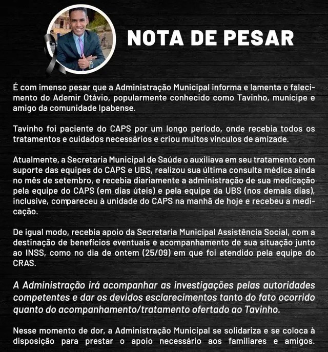 Nota de ´pesar divulgada pela prefeitura — Foto: Redes sociais