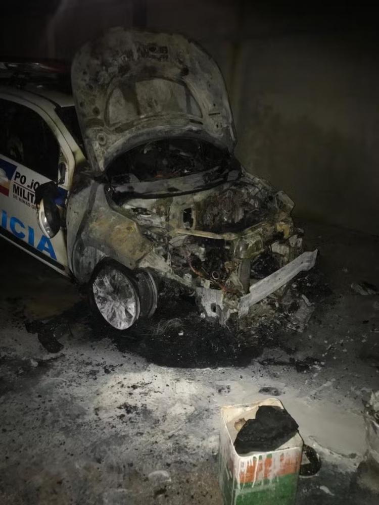 Viatura da PM queimada em Periquito — Foto: Redes sociais