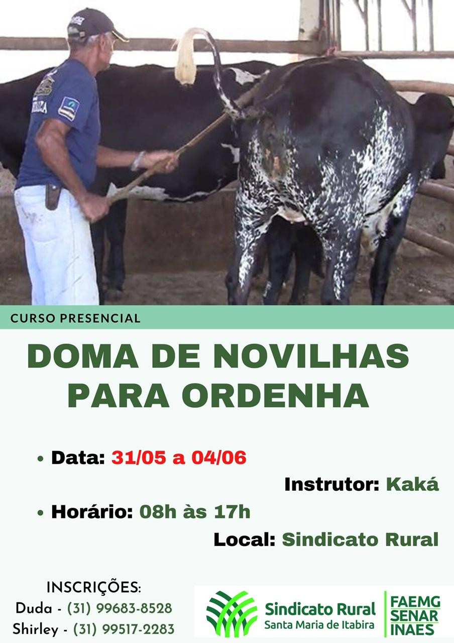 O Sindicato Rural de Santa Maria de Itabira está com oferecendo os cursos; Equitação/Rédeas, Doma de Novilhas para ordenha, Educação em finanças pessoais e Gestão de pessoas, há cursos online e cursos presencial.