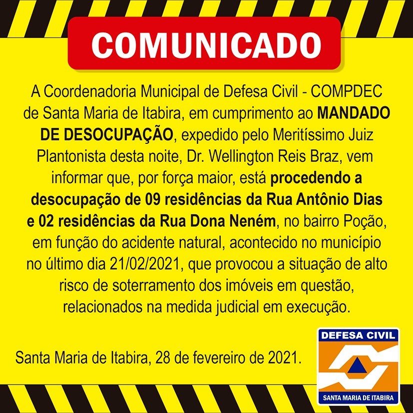 A Prefeitura de Santa Maria de Itabira já concluiu a remoção das nove famílias da rua Antônio Dias e de duas famílias da rua Dona Neném no bairro Poção em Santa Maria de Itabira, o mandado de desocupação foi expedido na noite de domingo (28) pelo juíz Wellington Reis Braz.
