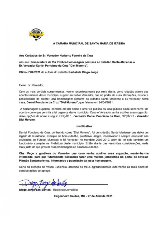 Na manhã do dia 27 de Abril , o Radialista Diego Jorge enviou um Ofício a Câmara Municipal de Santa Maria de Itabira, direcionado ao Vereador Norberto Ferreira da Cruz "Télo do Taxi" que é primo do falecido Diel Moreno. O ofício sugere ao parlamentar, que preste uma homenagem póstuma, nomeando alguma via pública ou outro local público que ainda não tenha nome, com o nome da figura pública. A sugestão foi feita pelo Radialista Diego Jorge, através do Ofício n° 02/2021 (veja)
