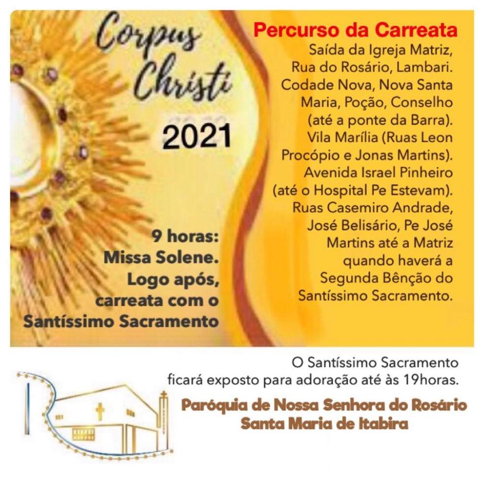 Feriado de Corpus Christi haverá carreata com Santíssimo Sacramento pelas ruas de Santa Maria de Itabira