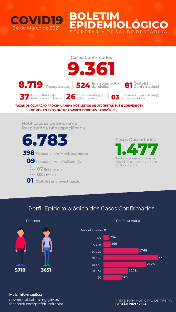 O boletim epidemiológico divulgado nesta quinta-feira (04/03), aponta que Itabira registrou mais (02) óbitos e 146 novos casos confirmados de coronavírus nas últimas 24 horas, com o total de contaminados chegando a 9.361 pessoas.