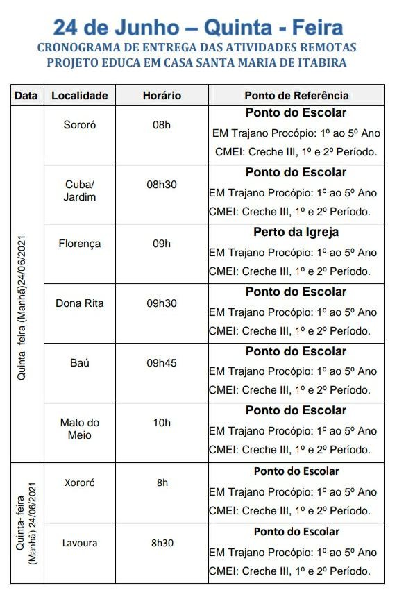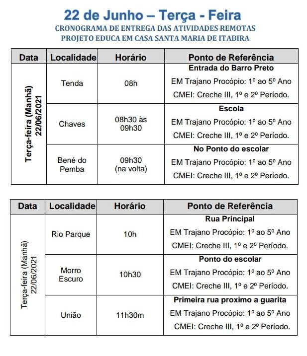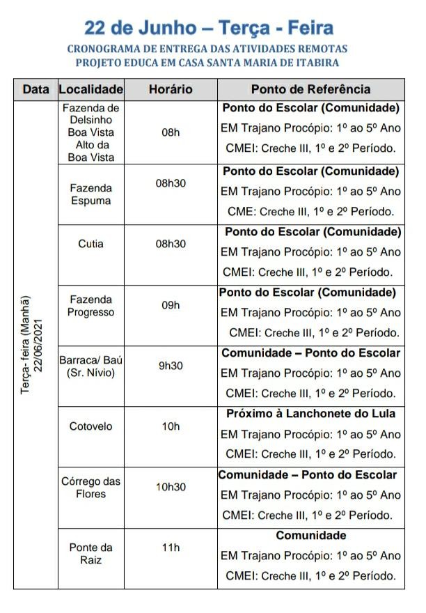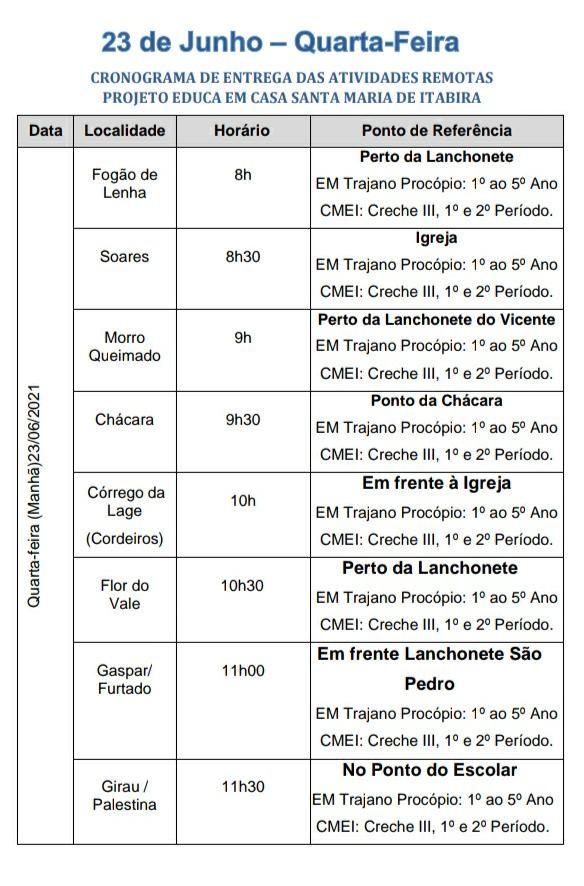 Nos dias 22, 23 e 24 de junho, não haverá entregas dos blocos de atividades nos bairros: Vila Marília, Borges, Centro, Nova Santa Maria, Poção, Conselho e Lambari nos pontos de referência.