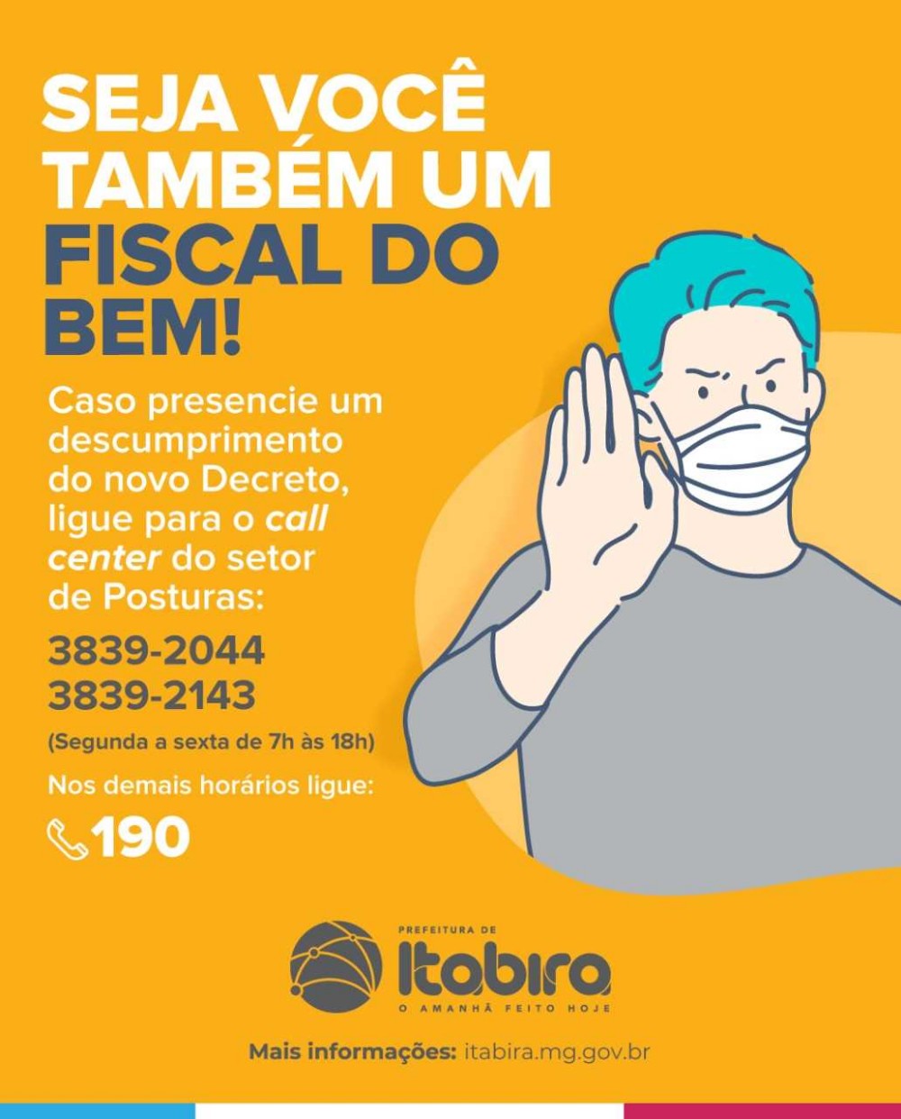 Caso a população identifique algum descumprimento do decreto em estabelecimentos comerciais e locais públicos, poderá ligar para o setor de Fiscalização de Posturas Municipais (3839-2044 e 3839-2143), de segunda a sexta-feira, das 7h às 18h. Se o problema ocorrer em outros horários e em imóveis particulares, é necessário acionar a Polícia Militar pelo número 190.