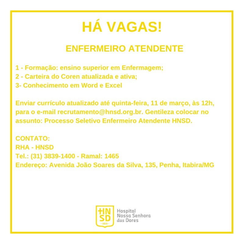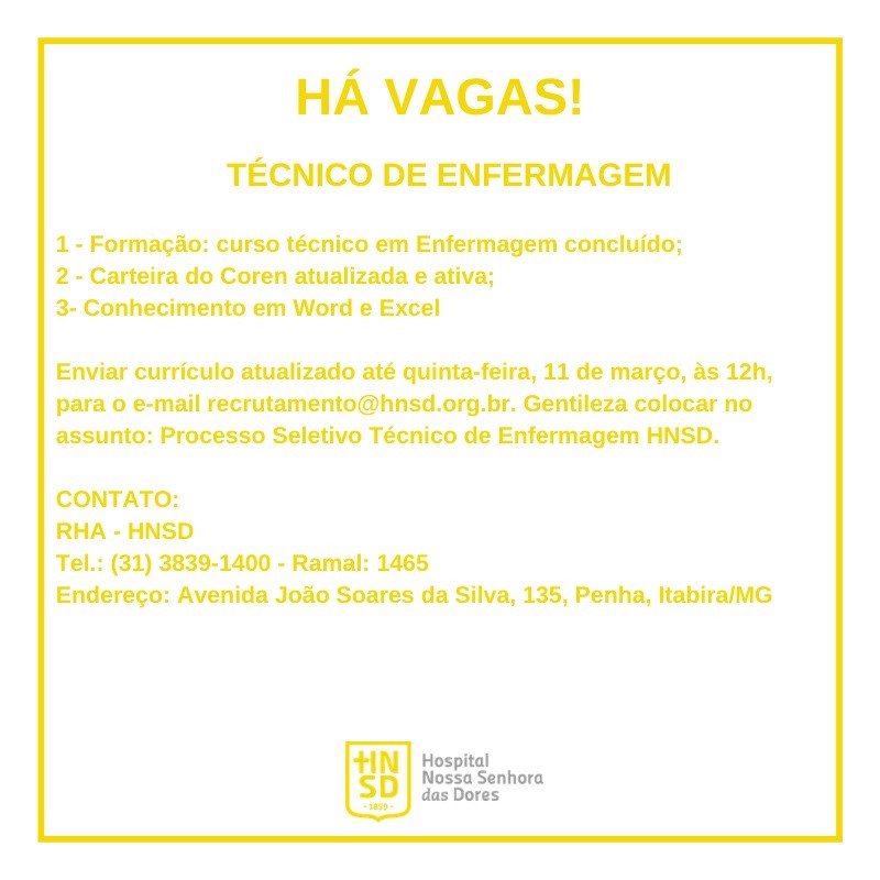 HÁ VAGAS! Os interessados devem enviar currículo atualizado para o e-mail recrutamento@hnsd.org.br até quinta-feira, 11 de março, às 12 horas.