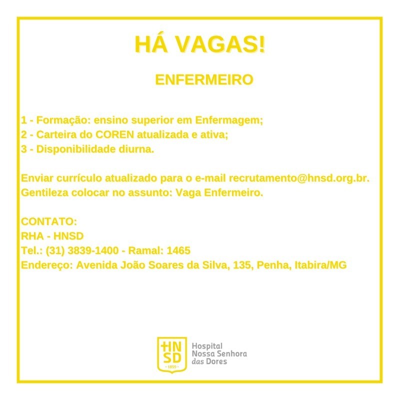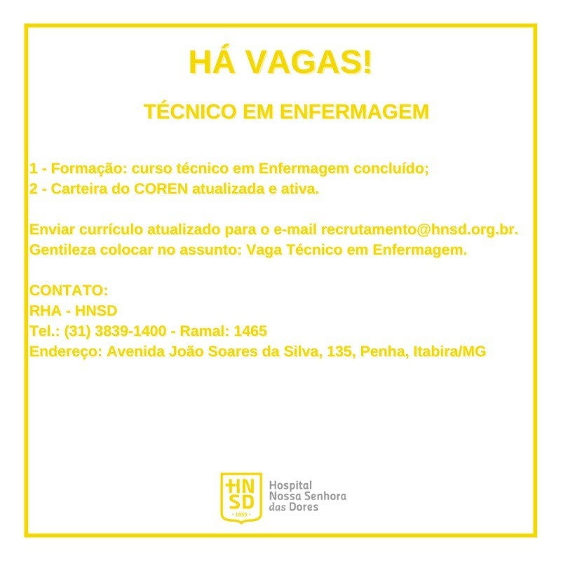 Os interessados devem enviar currículo atualizado para o e-mail recrutamento@hnsd.org.br.
