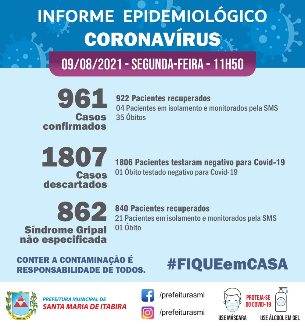 Boletim epidemiológico coronavírus da prefeitura de Santa Maria de Itabira