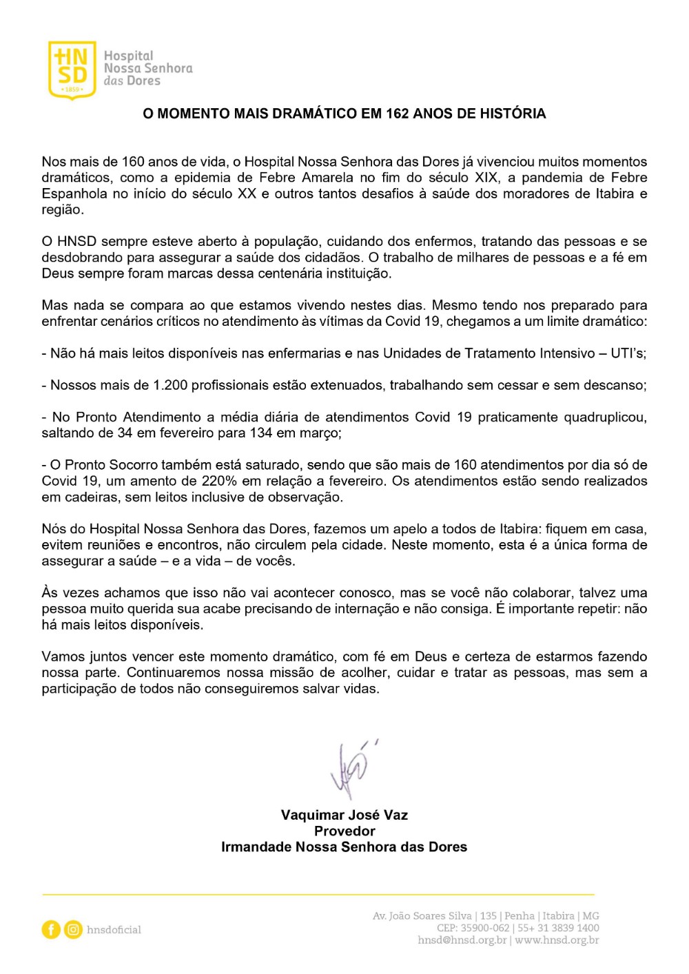 O provedor do HNSD, Vaquimar Vaz, divulgou uma carta aberta à comunidade de Itabira e região em que traz um balanço da situação do hospital e destaca que a instituição vive o momento mais dramático em seus 162 anos de história.