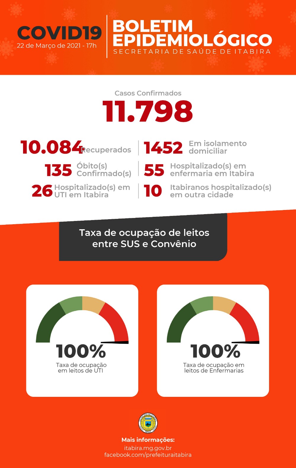 Nenhum leito de UTI para pacientes com covid-19 está disponível em Itabira, a situação de colapso é registrada em boletim divulgado pela prefeitura na noite desta segunda-feira (22): só no mês de março foram 58 mortes pela doença, só hoje foram confirmados 12 óbitos com coronavírus; totalizando 135 óbitos pela doença no município.