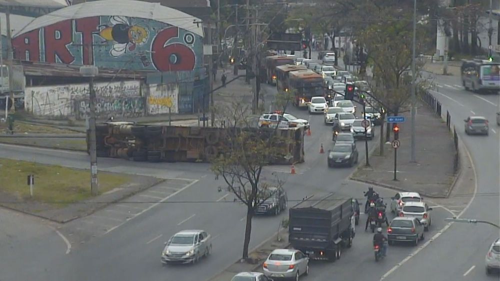 Uma carreta que transportava madeiras tombou na Avenida Amazonas, entre os bairros Madre Gertrudes e Jardinópolis, na Região Oeste de Belo Horizonte, na manhã desta terça-feira (5).