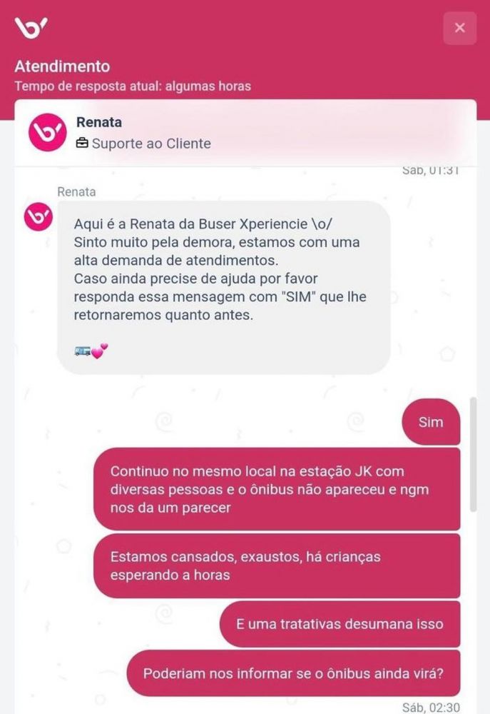 Glaysiele ficou aguardando no terminal do JK. Ela alegou ter entrado em contato com a Buser diversas vezes, pelos meios disponibilizados pela empresa. Não houve retorno pela plataforma da própria Buser, tampouco pelo aplicativo de mensagens. A engenheira disse, ainda, que o atraso prejudicou os planos de viagem para o feriado prolongado de Nossa Senhora Aparecida, entre sábado e terça-feira (12).